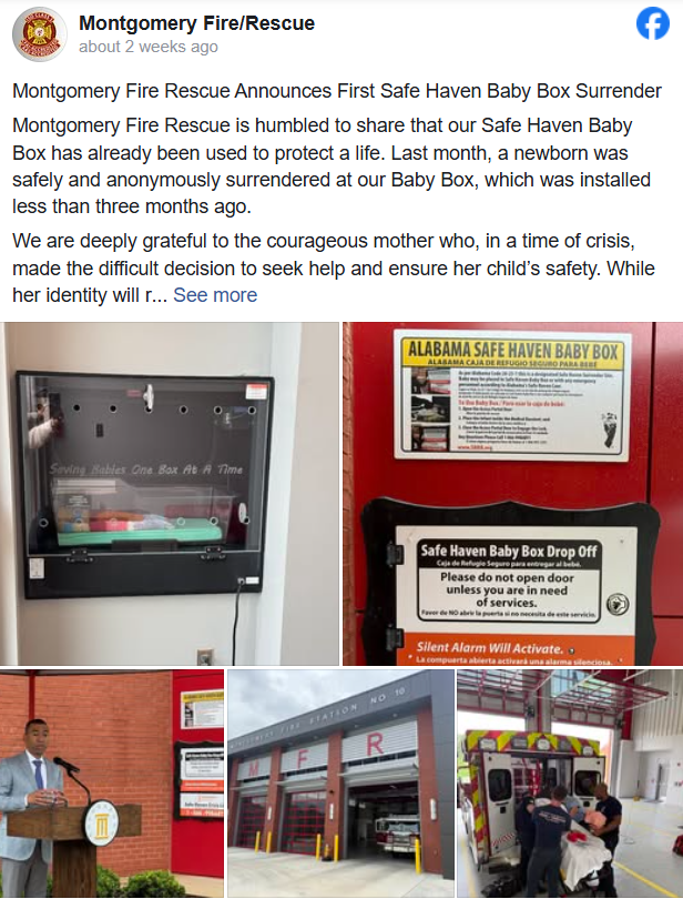 A newborn baby was surrendered at a Montgomery Fire Department last month after a Safe Haven Baby Box was installed in Alabama's capital city this May.